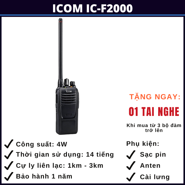 Bộ đàm Icom IC F2000 là dòng bộ đàm cầm tay dùng để liên lạc 2 chiều với rất nhiều tính năng ưu việt là sự lựa chọn phù hợp cho các tổ chức, cá nhân trong lĩnh vực bảo vệ, an ninh, điện lực, ngân hàng, công trình xây dựng, nhà máy, khu công nghiệp, nhà hàng, khách sạn, siêu thị, tòa nhà cao tầng hay các lực lượng cảnh sát, hải quan, kiểm lâm, bộ đội, cứu hộ, cứu nạn,…