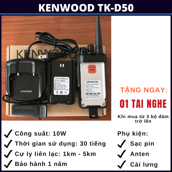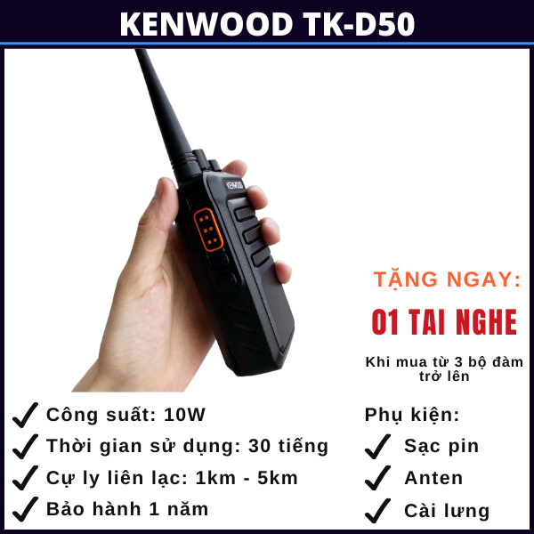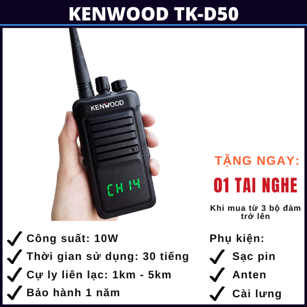 Bộ đàm Kenwood TK D50 là dòng máy bộ đàm dùng để liên lạc 2 chiều với rất nhiều tính năng ưu việt cùng cự ly liên lạc nhóm tới 5km là sự lựa chọn phù hợp cho các tổ chức, cá nhân thường xuyên làm việc trong phạm vi dưới 5km hoặc các tòa nhà cao tầng như các công trình xây dựng, khu du lịch, resort, các cửa hàng buôn bán, siêu thị, an ninh, bảo vệ, quán karaoke, quán nhậu, quán cafe, công tác đi rừng, đi biển hay kết nối giữa các xe oto trên cao tốc,…