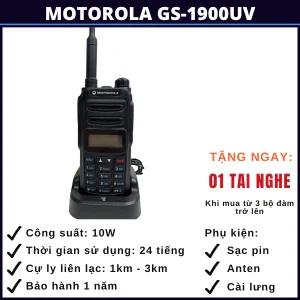 Bộ đàm Motorola GS-1900UV là thiết bị liên lạc 2 chiều tích hợp song song 2 băng tần số UHF, VHF với nhiều ưu điểm nổi bật so với các dòng bộ đàm khác như khả năng truyền phát tín hiệu qua vật cản rất tốt (UHF) hay truyền phát tín hiệu tầm xa trong môi trường trống trải (VHF). Người sử dụng dễ dàng linh hoạt sử dụng dải tần số phù hợp với điều kiện làm việc của mình bằng cách kết nối với các máy bộ đàm có cùng tần số và kênh liên lạc. Người nói chỉ cần bấm và giữ nút PTT để truyền thông tin đến người nghe và bỏ nút PTT khi muốn nghe thông tin từ người đang đàm thoại với mình.