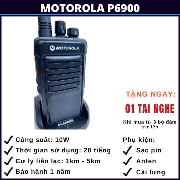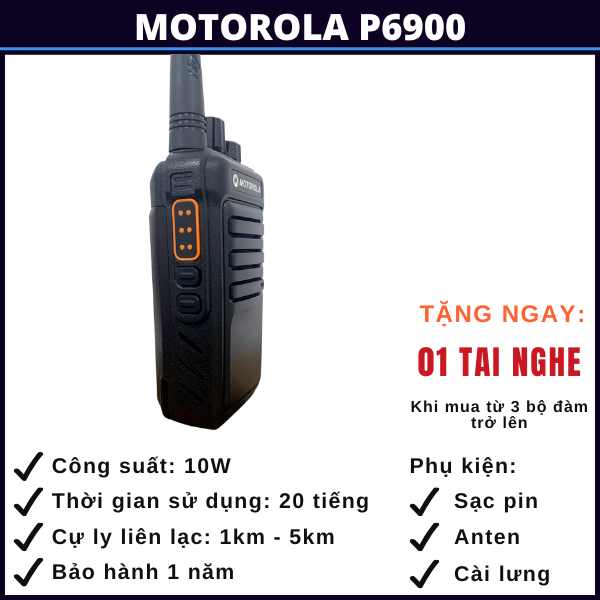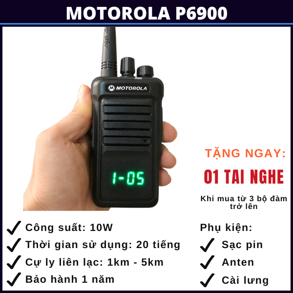 Bộ đàm Motorola P-6900 là dòng bộ đàm cầm tay dùng để liên lạc 2 chiều với rất nhiều tính năng ưu việt như công suất phát lớn (10W), cự ly liên lạc nhóm tới 5km là sự lựa chọn phù hợp cho các tổ chức, cá nhân làm việc trong phạm vi rộng như bến cảng, nhà kho, tòa nhà, siêu thị, công trình xây dựng hoặc các nhóm đi phượt hoặc dùng để kết nối giữa các oto trên cao tốc,…