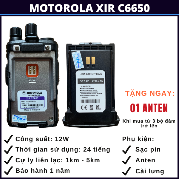 Nếu bạn đang tìm kiếm một giải pháp liên lạc tin cậy và hiệu quả cho công việc hoặc hoạt động ngoài trời, bộ đàm Motorola Xir C6650 là sự lựa chọn hoàn hảo. Với thiết kế chắc chắn, tính năng đa dạng và khả năng hoạt động ổn định, bộ đàm này đáp ứng đầy đủ nhu cầu của người dùng.