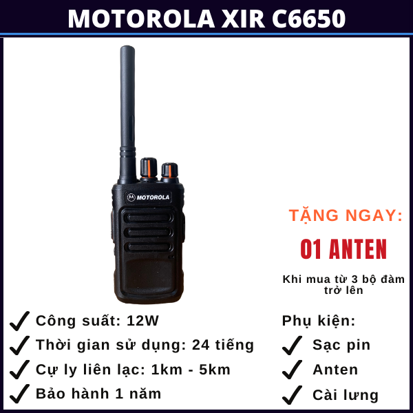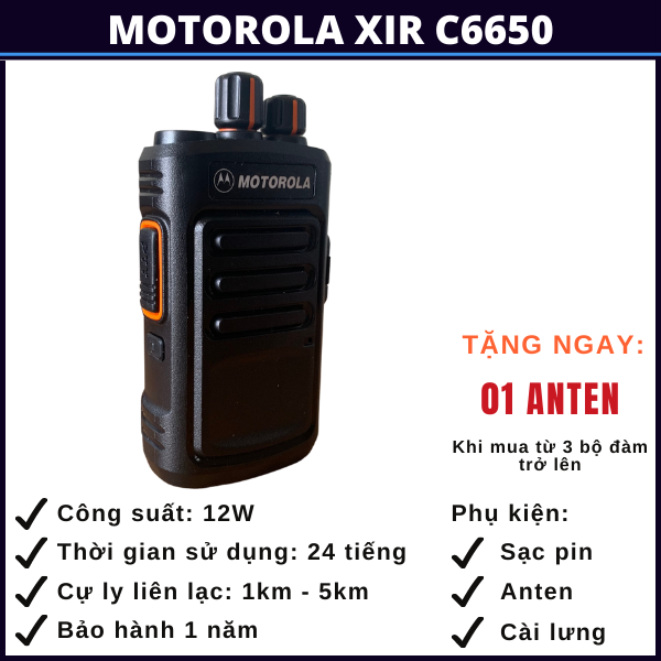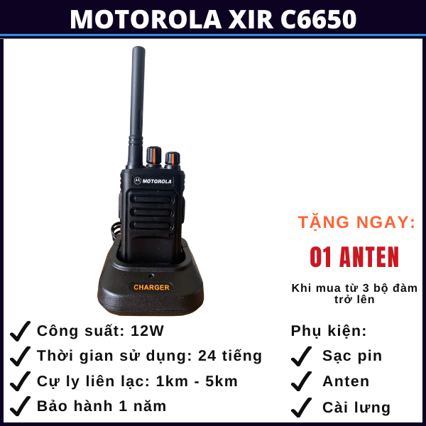 Bộ đàm Motorola Xir C6650 là một trong những sản phẩm hàng đầu trong dòng bộ đàm chuyên nghiệp của Motorola. Được thiết kế để đáp ứng các yêu cầu cao về liên lạc trong môi trường khắc nghiệt, Xir C6650 cung cấp khả năng truyền tải tín hiệu rõ ràng và ổn định ngay cả trong các khu vực khó khăn.